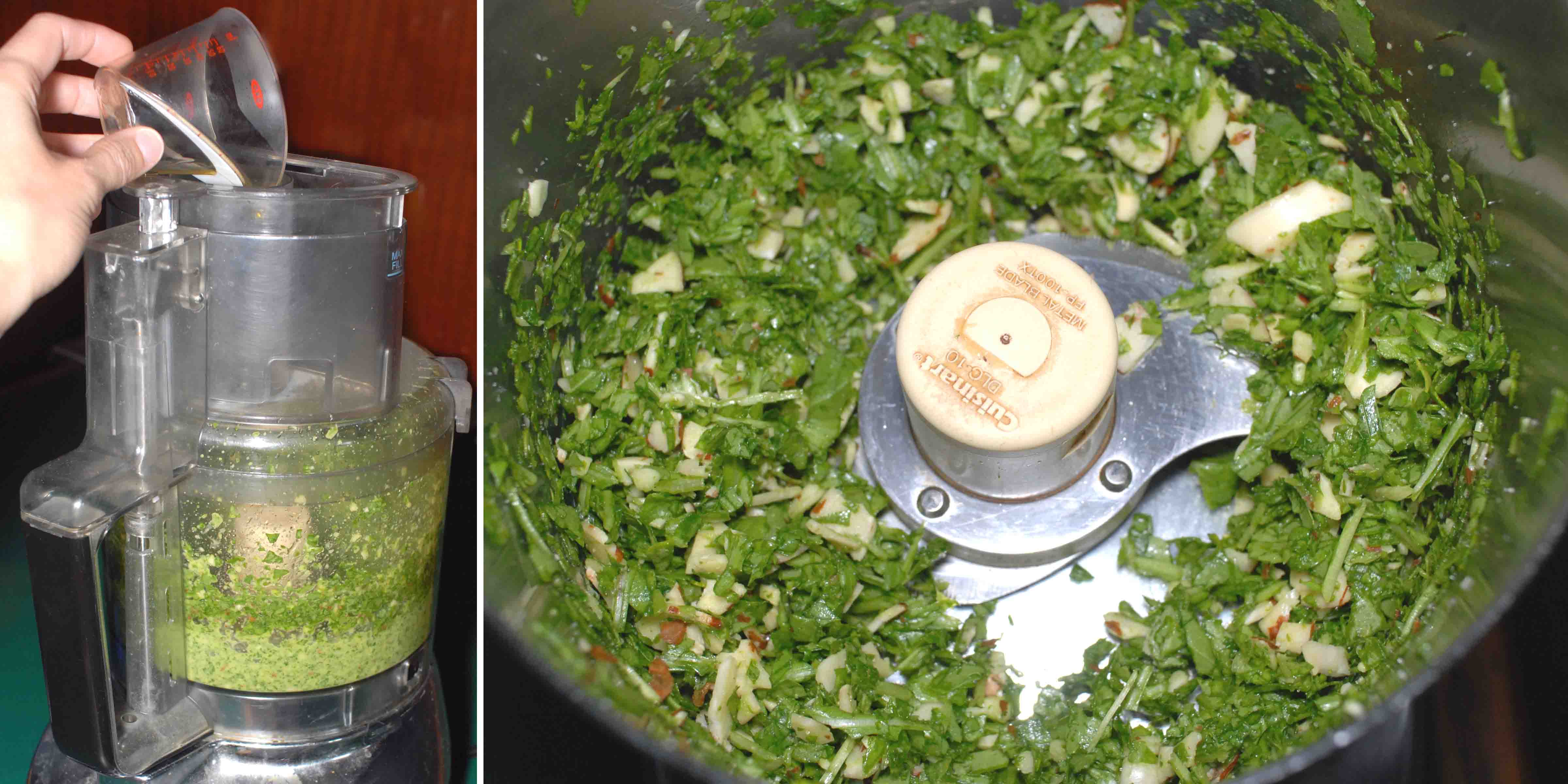 - Mix together olive oil and lemon juice. Pour liquids down the chute with the food processor running.