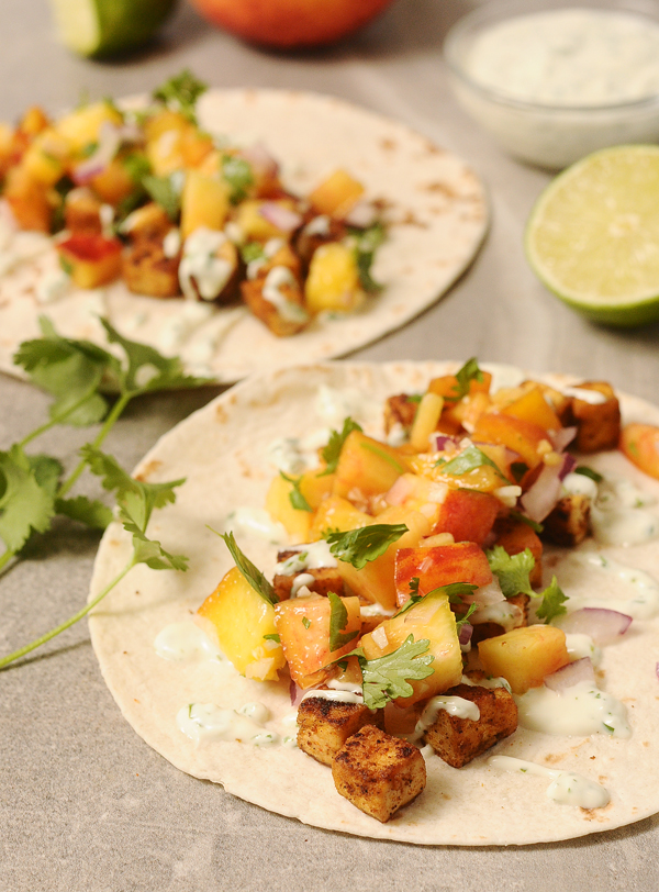 These tacos have everything going in the flavor department. The blackened tofu is salty and spicy, the peach salsa is juicy and sweet, the cilantro lime crema is creamy and tangy. A tortilla for delivery and you have a homerun dinner!