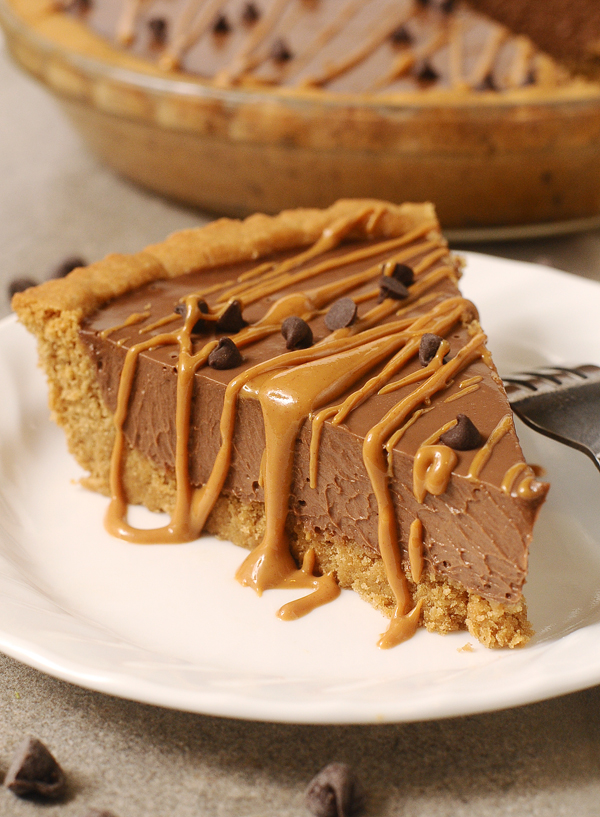 This chocolate peanut butter pie is made with a peanut butter cookie crust. The pie has a secret ingredient that makes it dairy free and low fat: silken tofu! The texture of the pie is so creamy and dreamy that you would never guess it wasn’t loaded up with heavy cream. The flavor is intensely chocolatey and rich, the perfect treat when drizzled with extra peanut butter!