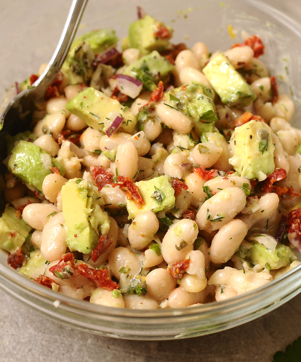 I load up these marinated beans with extras to make it a salad so it makes lunch all on its own. The sun-dried tomato adds umami and a delicate chew. The avocado makes it just that much more creamy and the fresh red onion adds a little bite and texture. Soak the onion in water before mixing into the salad if you want to reduce the onion-y flavor.