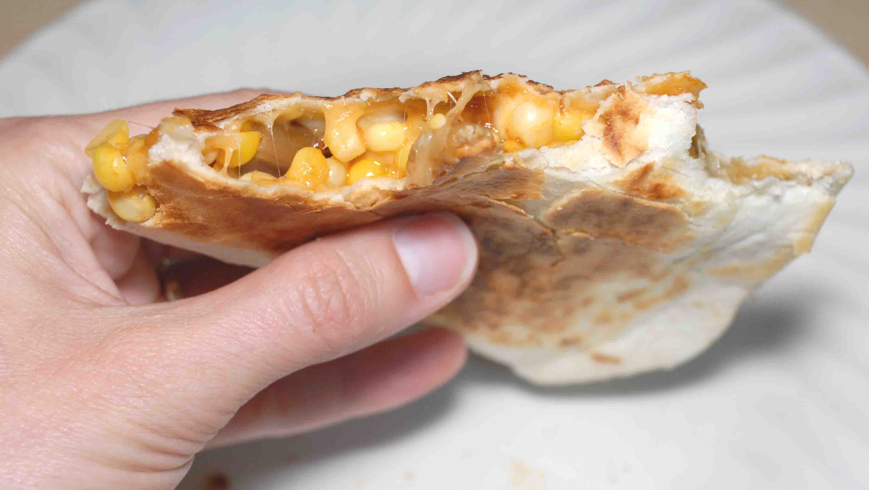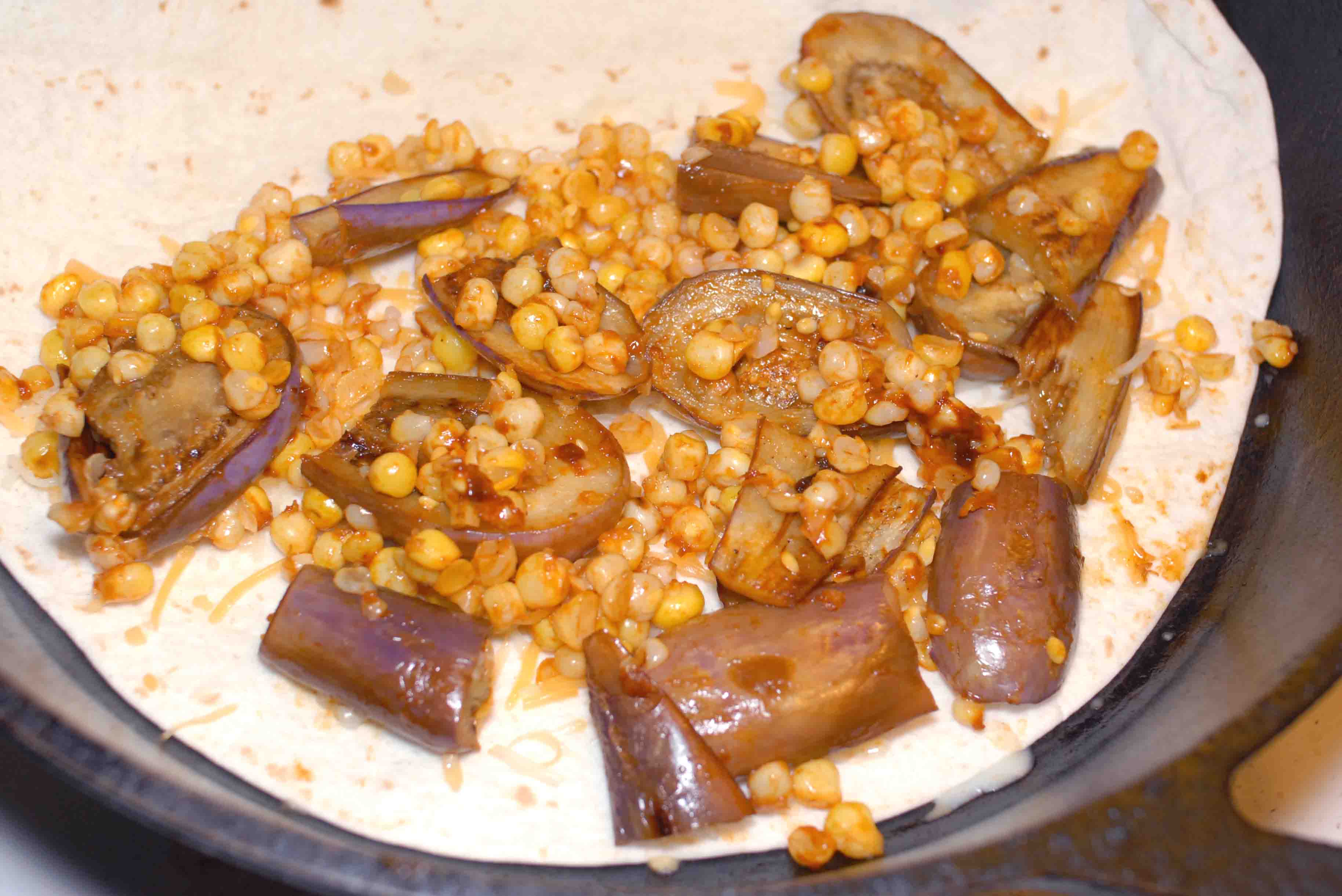- Place the tortilla in the preheated pan. On one half of the tortilla, layer 2 TBS cheese, veggies, and remaining cheese. Close tortilla by folding over the unfilled side.