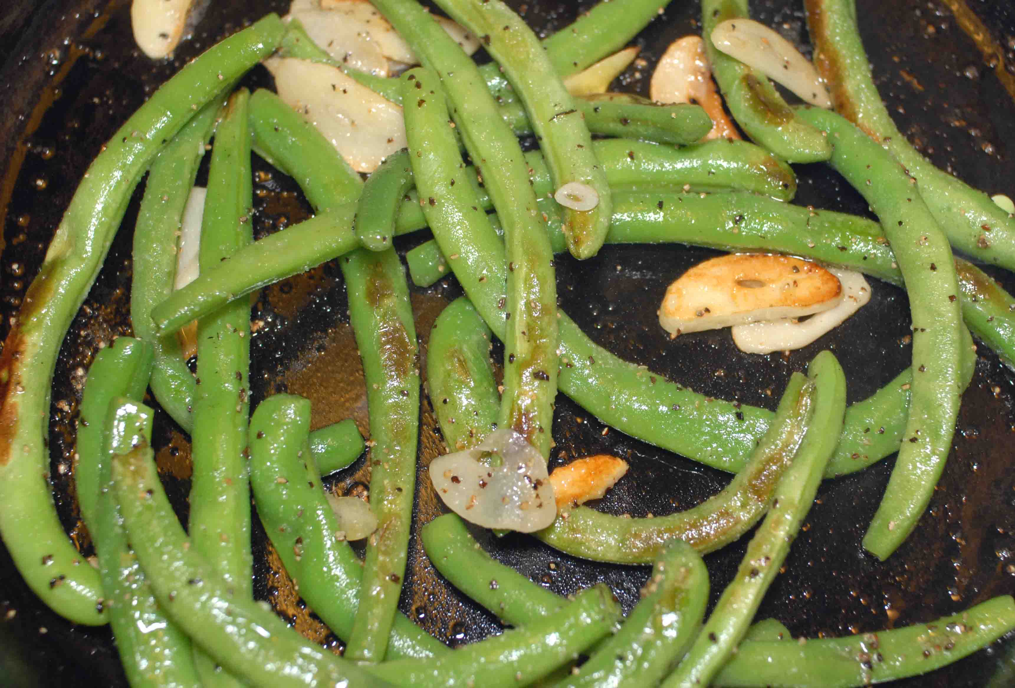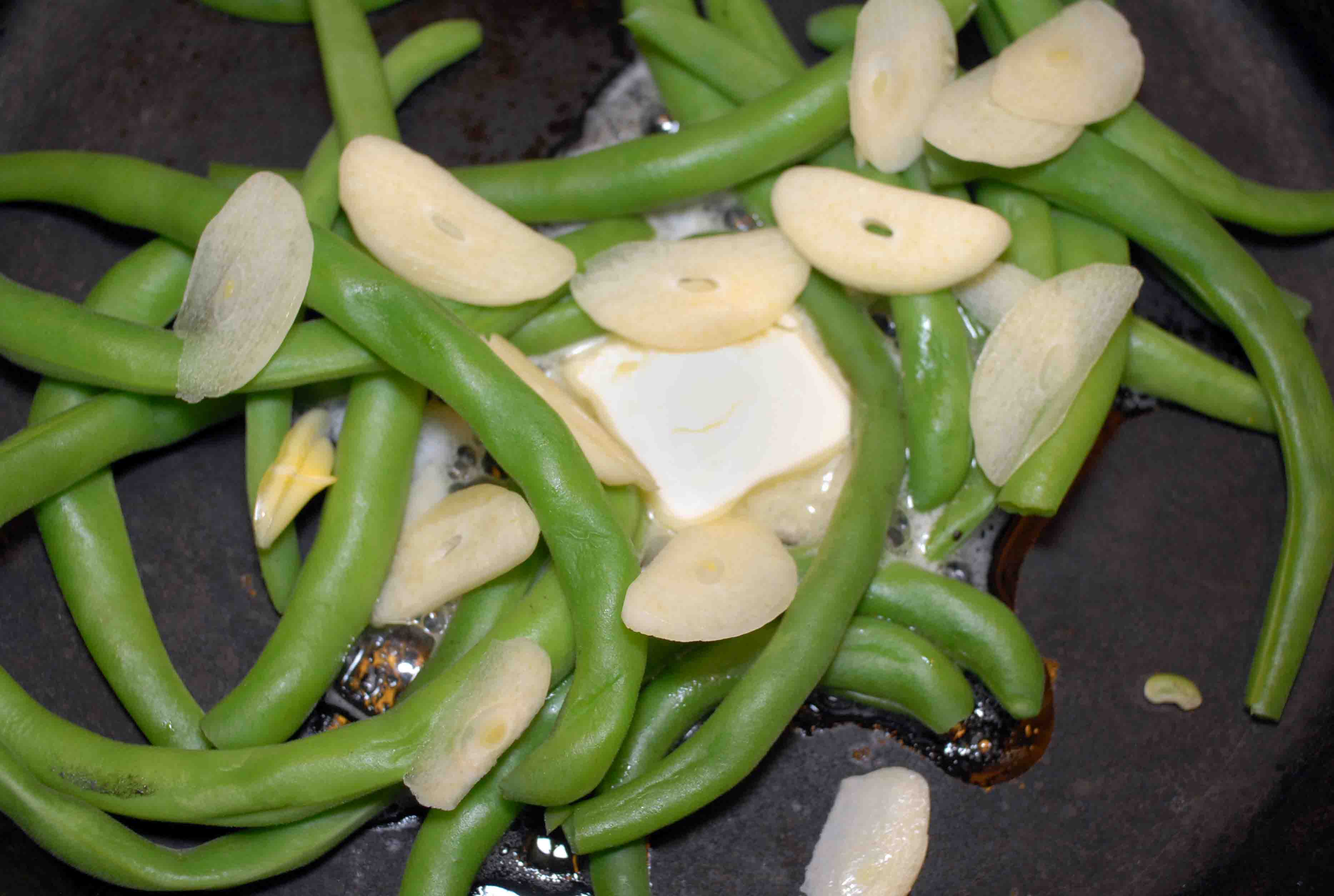 - Add the butter and garlic to the green beans and saute until garlic is golden and green beans are starting to blister, 2-3 minutes.