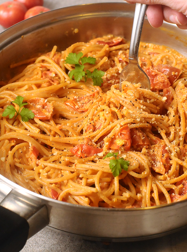 Now in the depths of winter my garden is long dormant with no tomato in sight and I am craving this creamy and unbelievably easy pasta dish.