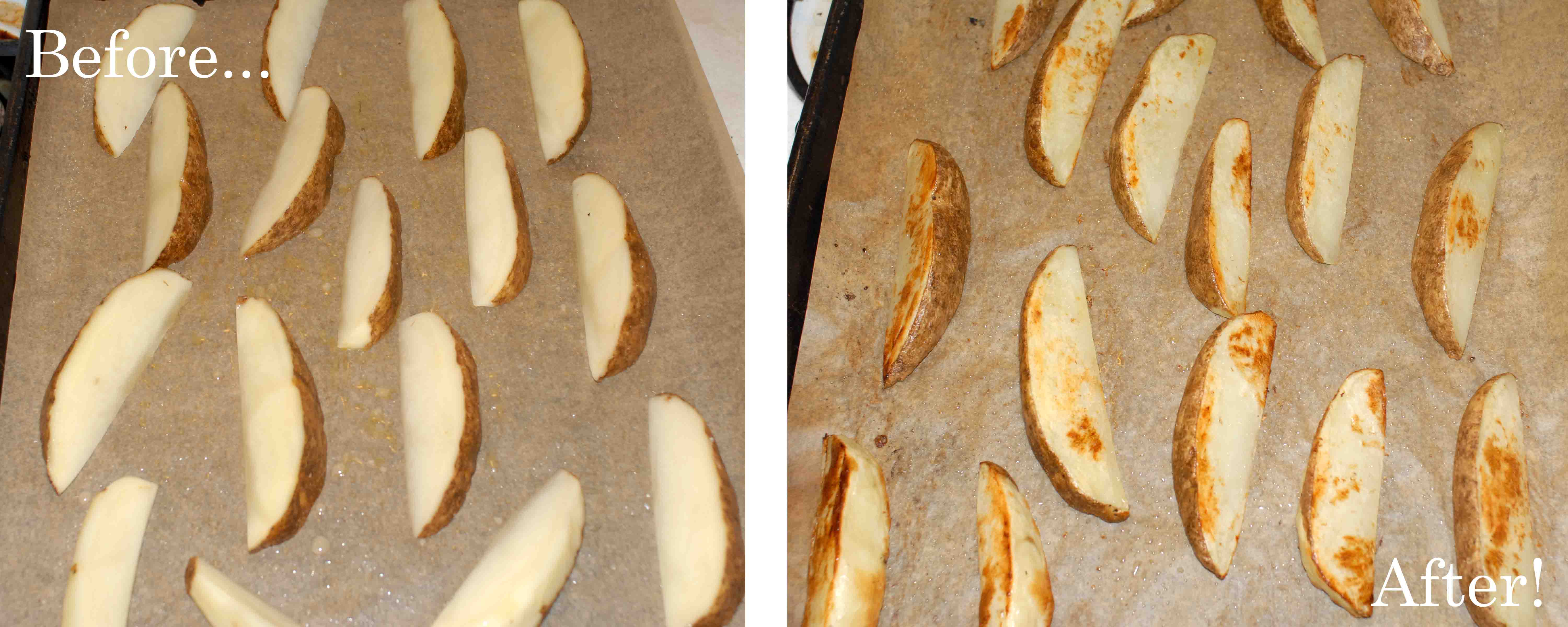 - After 30 minutes of soaking (more soaking is ok, less is not), drain water from potatoes and transfer to a parchment lined baking sheet. Arrange wedges in a pile and drizzle with oil and salt. Massage with your hands to evenly distribute oil and salt, then evenly space wedges across baking sheet.