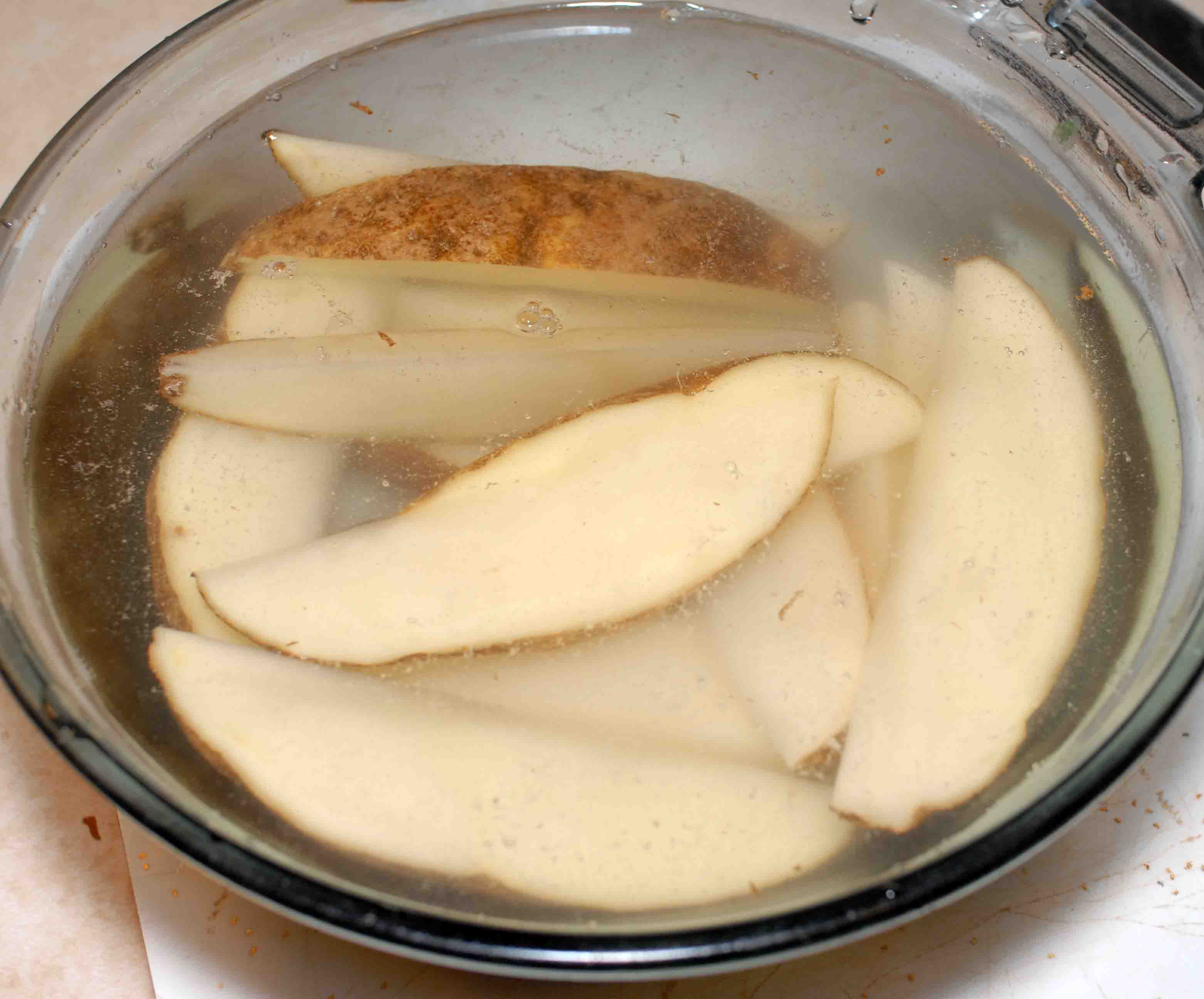 - Cover potatoes completely with water. Let soak for 15 minutes.