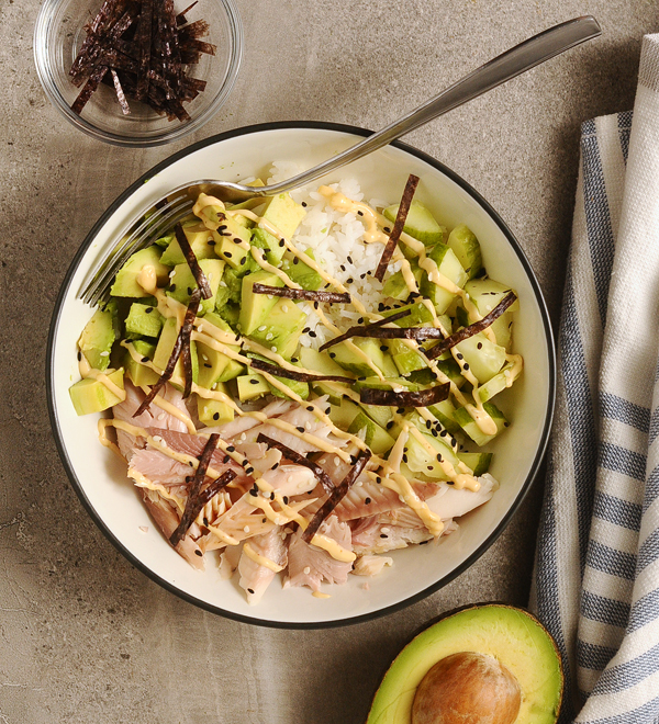 - Layer three bowls with the rice mixture, diced cucumber, diced avocado, and flaked smoked trout. Drizzle with the sriracha mayo and sprinkle with the noir sheet pieces and sesame seeds.