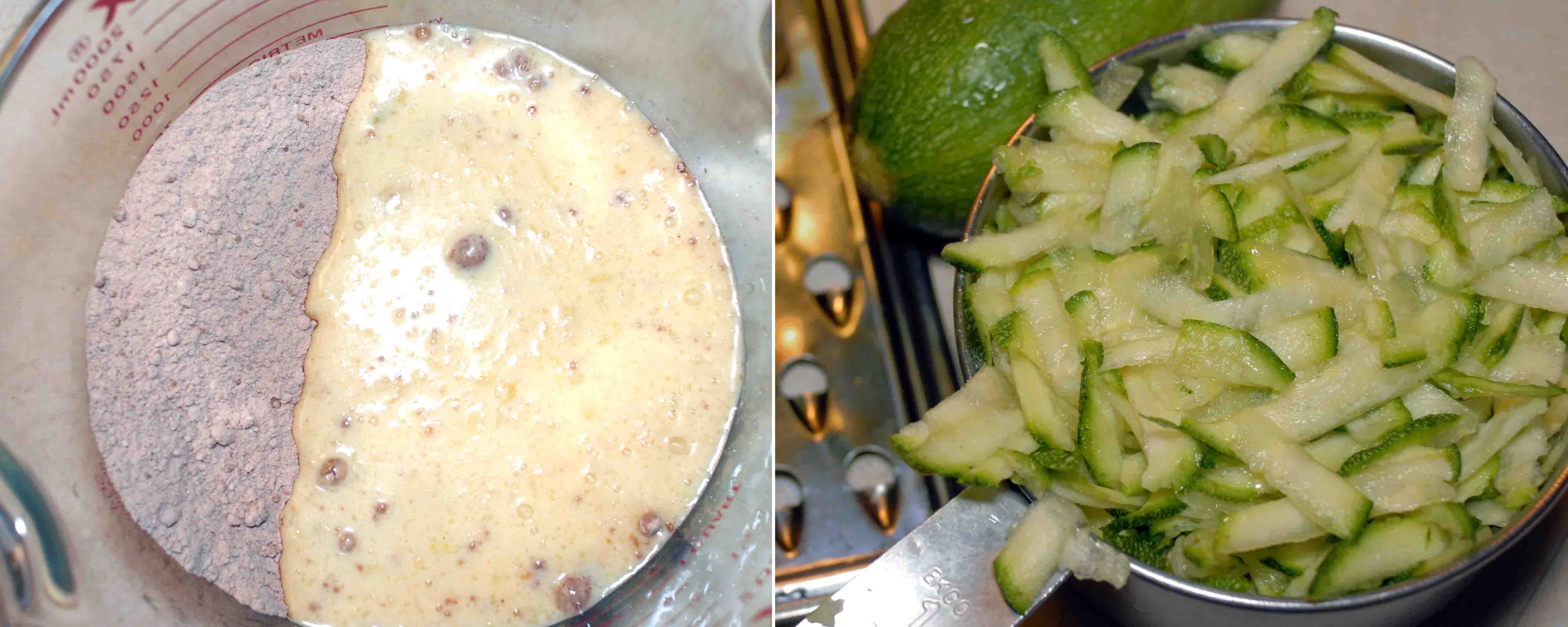- Mix wet ingredients into dry ingredients and stir until just incorporated. Stir in zucchini and ¼ c chocolate chips.